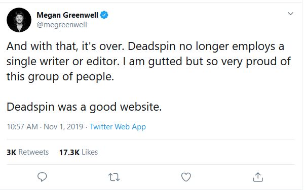 I haven’t been able to confirm the posted Tweet, but Greenwell has been keeping close tabs on the now former employees of Deadspin. I assume the current owners of Deadspin will be able to keep the outlet running in some fashion — not that I’ll know, I unsubscribed. However the Spinoffs have already shown some plutocratic troglodytes the downside of buying a company and bullying the employees.