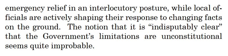 It’s worth noting that the three of the four dissenters here joined Koremastu II (and Kavanaugh certainly would have), finding no First Amendment violation in a case where there was extensive evidence of religious animus and the “security” considerations were a figment of Donald Trump’s imagination. My favorite part is that Alito dissented — if a case is politically salient, the Republican policy preference is his only criterion — but he refused to join Kavanaugh’s Daily Caller blog post, understanding that if you don’t have the votes to win on an application for injunctive relief it’s better to remain silent than to shove all your chips into the middle of the table with a smirk and then reveal a busted straight. Alito was always smarter.
