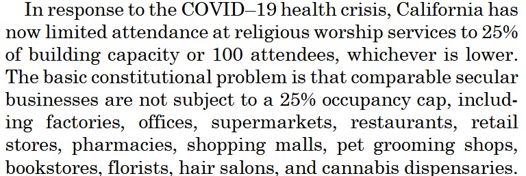California’s social distancing protocols currently allow religious institutions in the state to open only a 25% capacity. This makes sense — people being in close proximity for an extended period with periodic singing is extremely dangerous. Some churches filed a frivolous lawsuit alleging that this requirement violates the free exercise clause of the Constitution. Friday night the Supreme Court refused to issue an injunction — so far, so good.