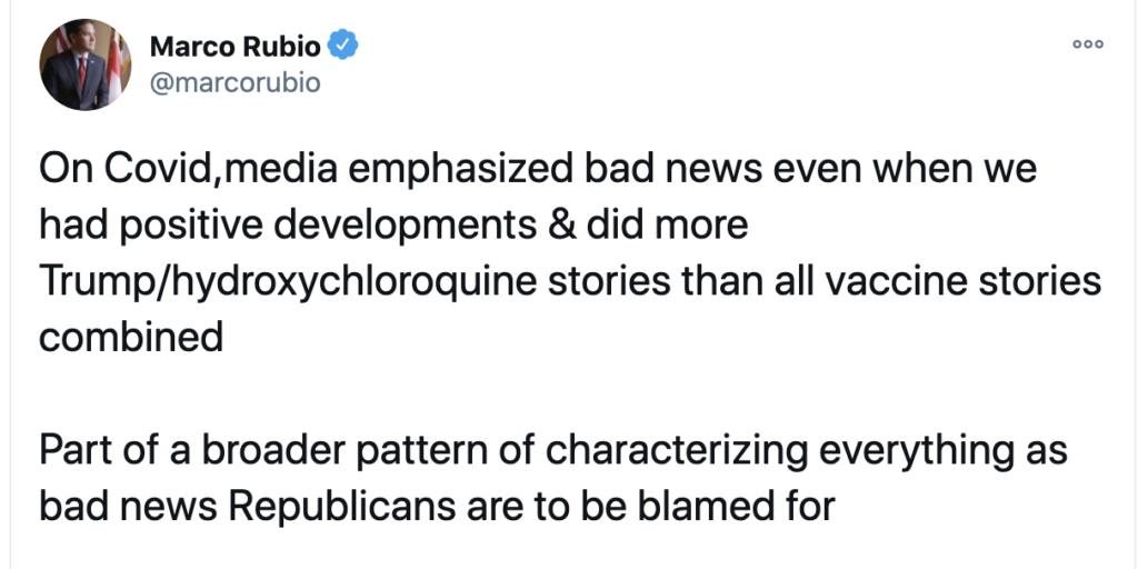 Leaving aside the fact that the development of vaccines has received a great deal of media coverage, again the remarkably rapid development of a vaccine makes the Republican non-response much worse. We just needed a few months of patience to suppress the virus while providing people and businesses (like those providing indoor dining and drinking, gyms, etc.) that should be closed with a financial bridge to make it through. The complete Republican failure to respond deserves much more negative press than it receives, and Rubio and his fellow Republican senators in particular are behaving reprehensibly, producing a lot of avoidable death and suffering to extract symbolic revenge on states that try to provide good services to their citizens.
