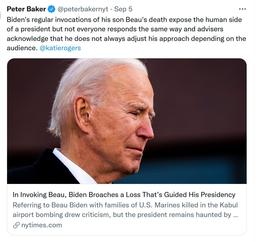 Joe Biden’s sadness over his son Beau’s death has many in Washington yearning for the empty narcissism of Donald Trump.— New York Times Pitchbot (@DougJBalloon) September 6, 2021