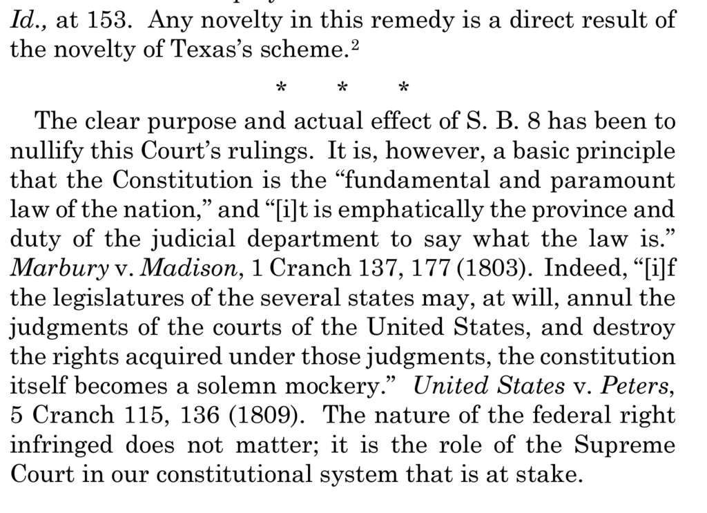 As Roberts’s dissent-on-most-points opinion observes, “Any novelty in [the remedy of allowing challenged to S.B. 8 to proceed] is a direct result of the novelty of Texas’s scheme”: