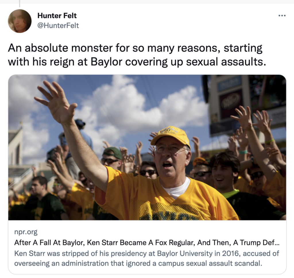 BREAKING via @CNBC: Ken Starr, prosecutor in Clinton Whitewater probe, dies at 76https://t.co/Yy60REIkNV— Emma Kinery (@EmmaKinery) September 13, 2022