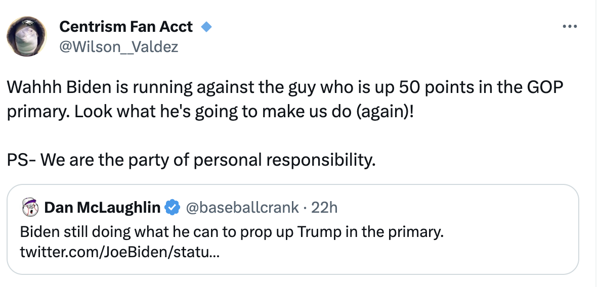 First of all, Biden’s tweet about Trump’s “moderation” on abortion being an obvious sham was very obviously directed at the general election electorate, not the Republican primary electorate (not least because there is not actually a competitive Republican primary.) But leaving that aside, the idea that Trump and Trump allies consistently win primaries not because rank-and-file Republican voters love Trump but because Democrats have tricked them into supporting MAGA candidates by running ads and tweeting statements accurately describing their unpopular policies and/or actions is one of the few political arguments more pathetic than “Republicans had no choice but to go fash because Democrats didn’t just let Romney win in 2012.” Why do you keep deluding yourself?