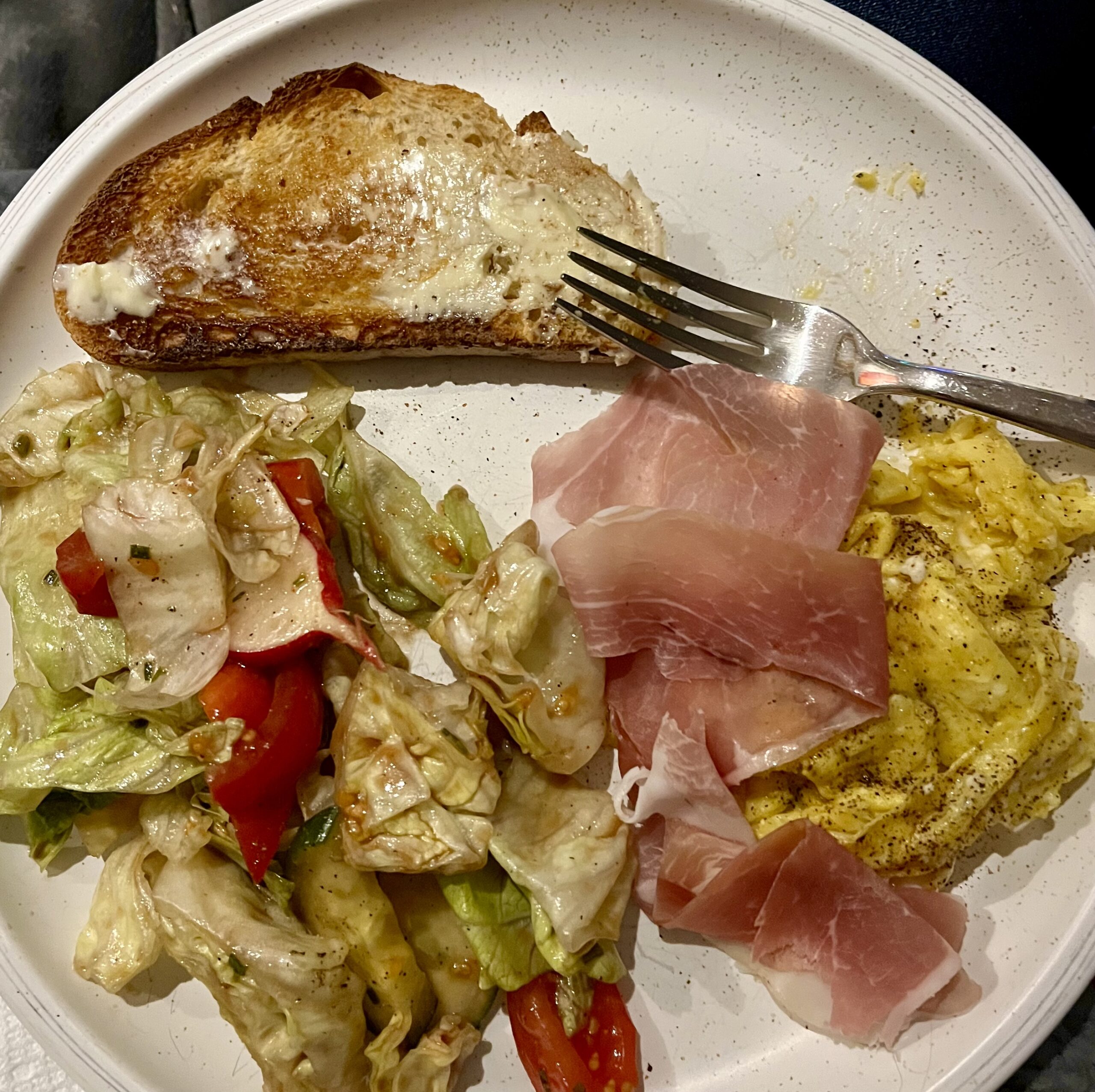 - Pile a couple of pieces of thinly-sliced prosciutto that have been torn in half on top the eggs.