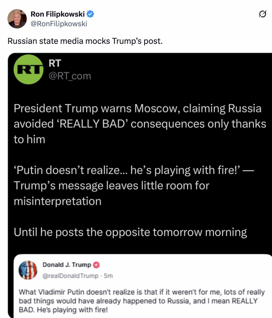 The president posted to Truth Social Tuesday morning claiming that if it wasn’t for him, “lots of really bad things would have already happened to Russia, and I mean REALLY BAD,” accusing the Russian president of “playing with fire.”
