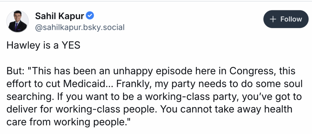 Hawley talking about this like he’s not a United States senator with a critical vote (Thune wants Tillis to have a golden ticket so he had real leverage here) is just extremely Josh Hawley. As always, taking Hawley’s “economic populism” seriously isn’t like expecting Lucy to hold the football. It’s still running to kick it when Lucy drove away three hours ago. Anyway, one might take his vote for the largest upward distribution of wealth in American history, including savage cuts to Medicaid and SNAP, as a long overdue hint that he’s a smarmy bullshit artist who has always supported Ryanomics, only if you didn’t understand this already you’re never going to.