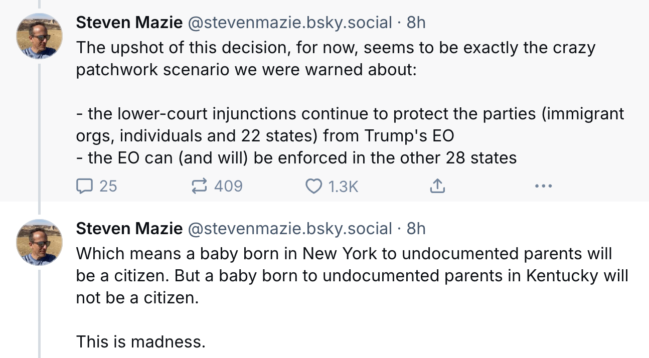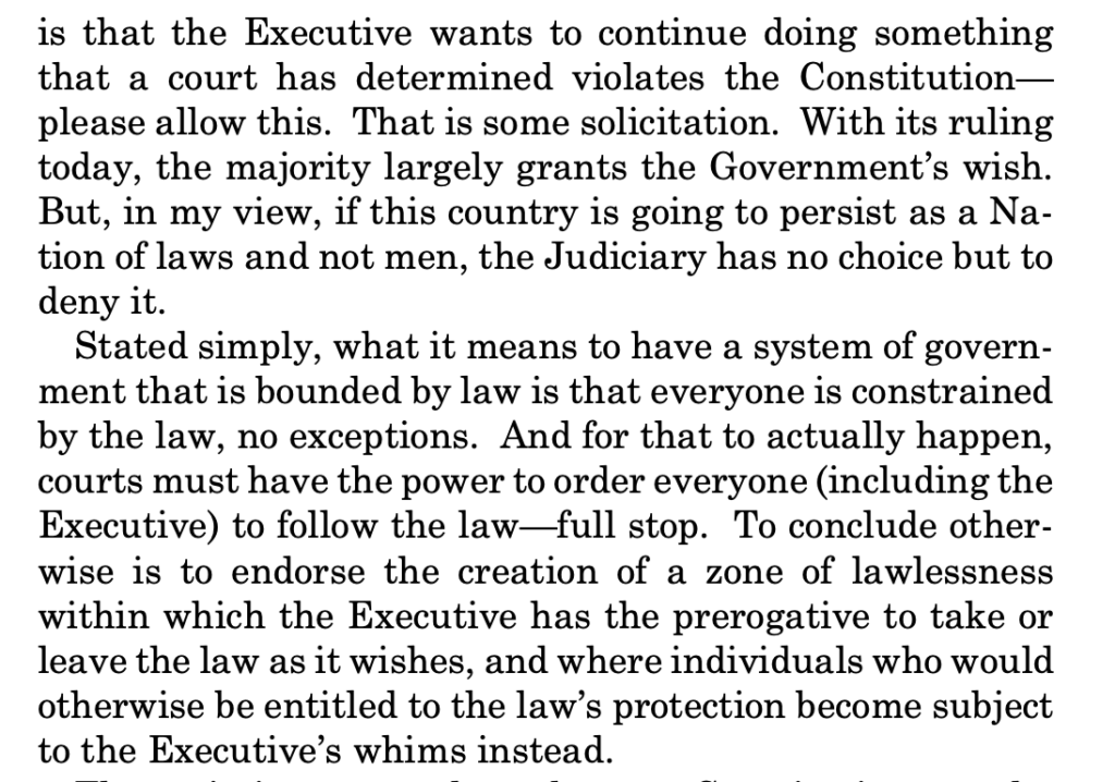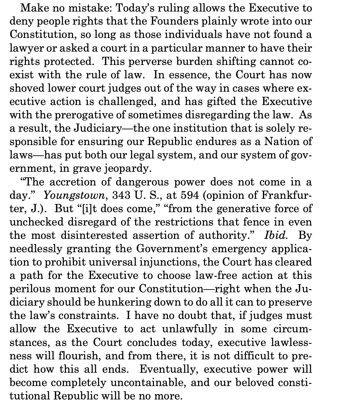 This patchwork, needless to say, is precisely what the 14th Amendment foreclosed through unambiguous language. The majority has essentially re-established the Dred Scott dual citizenship regime the core purpose of the 14th Amendment was to avoid. It’s lawlessness multiple times over.
