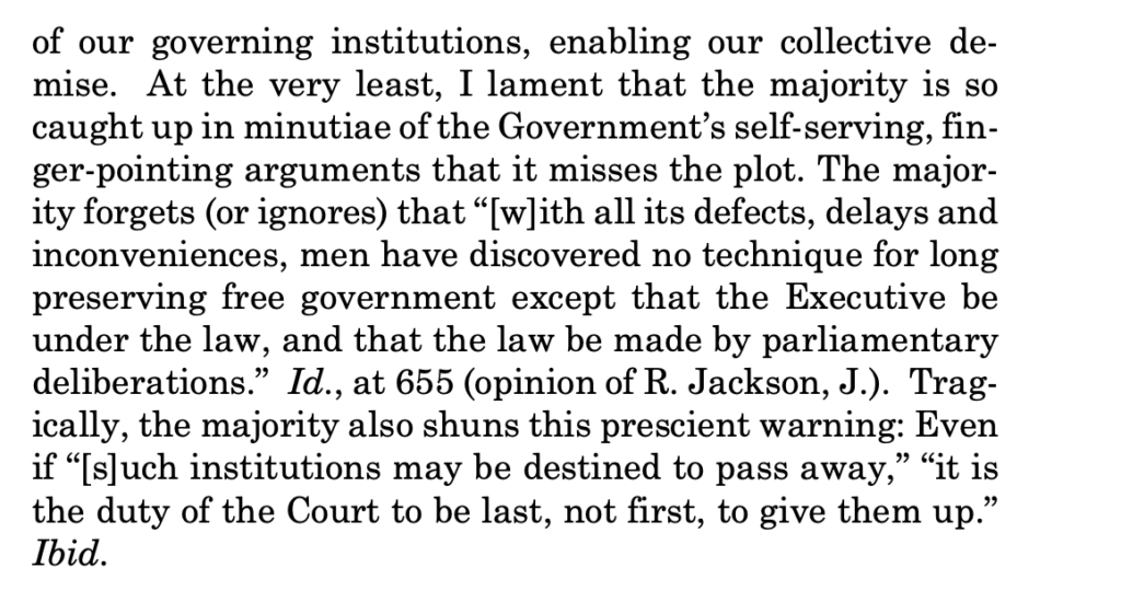 The majority’s assertion that District Courts did not have the authority to enforce universal injunctions because this is not consistent with the equity powers of the 18th Century High Court of Chancery in England is, as Sotomayor points out at length, unpersuasive on its own terms. But there is the additional problem that the Constitution of the United States did not establish a monarchy. Even if the majority’s characterization of the equity power of Enlgish courts was correct, it cannot be dispositive when considering how the federal courts of the United States can respond to lawless actions by the executive branch.