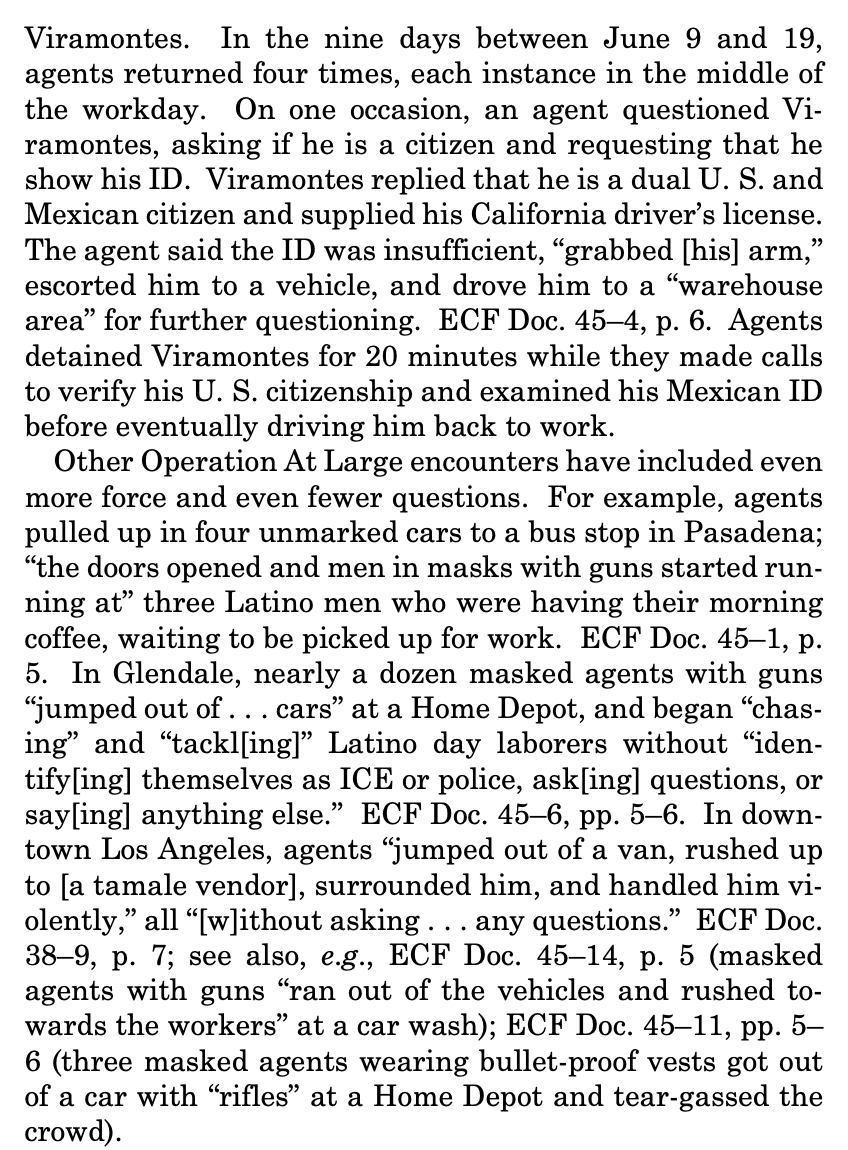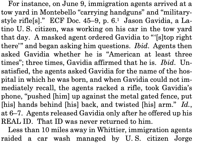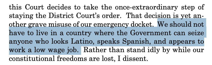 Kavanaugh’s concurrence — some crude, dishonest, partisan policy arguments concluding with a grimly greasy pean to judicial restraint, which makes you understand why the other Republicans on the Court prefer to remain silent in these cases — tries to minimize the Court’s green light to racial profiling by asserting that “[i]f the officers learn that the individual they stopped is a U. S. citizen or otherwise lawfully in the United States, they promptly let the individual go.” As Sotomayor says, this is completely at odds with the facts of the cases under consideration: