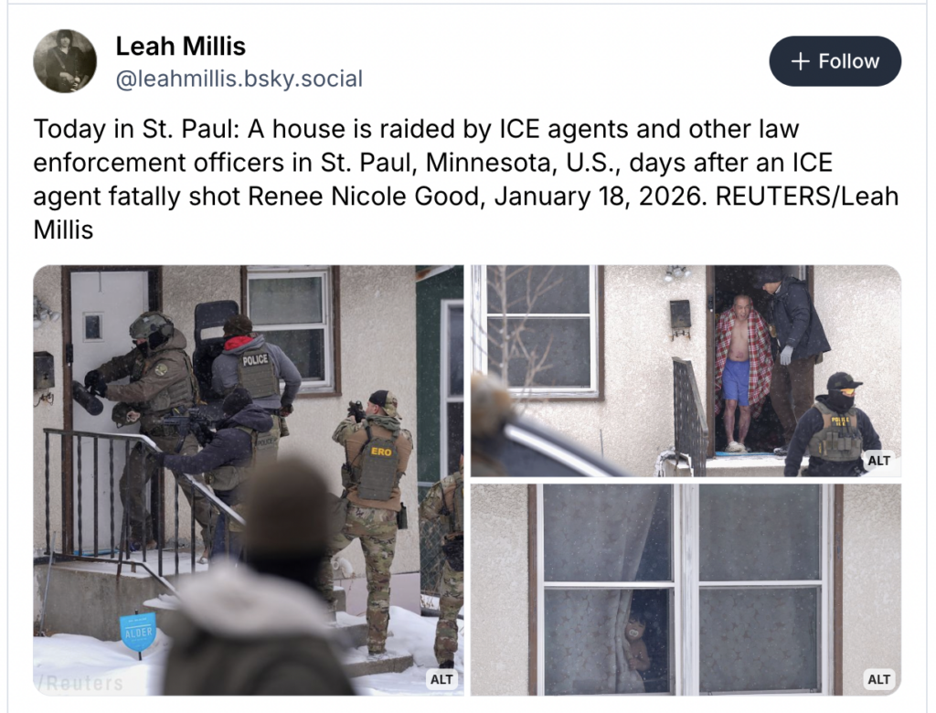 It’s an image that will knock you sideways: As snow falls, an elderly man wearing nothing but blue boxers and white Crocs with his hands restrained behind his back is forced out of his home by ICE agents. In the photo captured by photojournalist Leah Millis, you can see a red and white plaid blanket is draped around the man’s shoulders, but his chest is completely bare, exposing him to the harsh elements. It’s something out of a nightmare. It’s something that happened in St. Paul on Sunday.