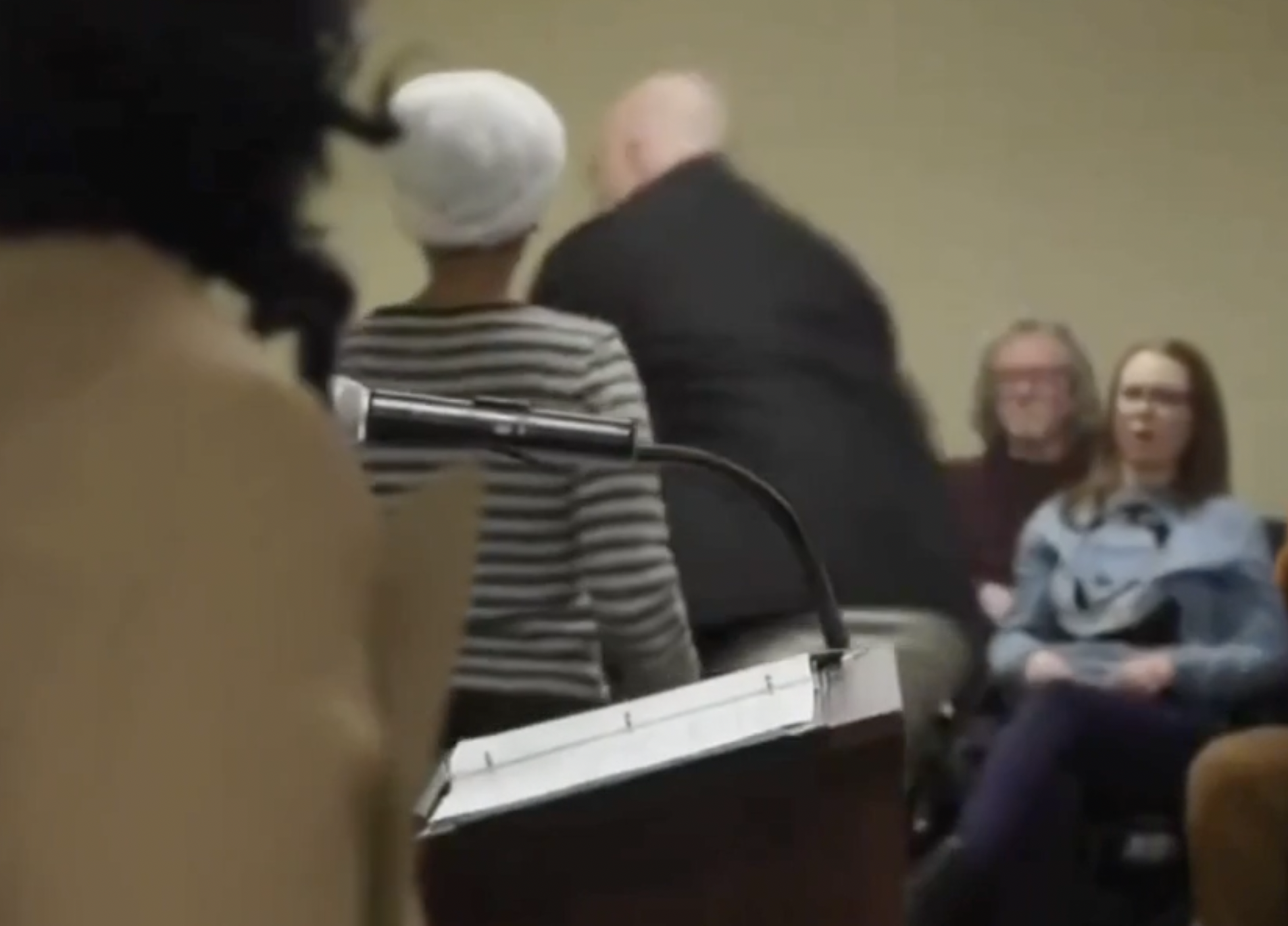 The audience cheered as the man, who was wearing a black jacket and holding a syringe, was pinned down and his arms were tied behind his back. In video of the incident, someone in the crowd can be heard saying, “Oh my god, he sprayed something on her.”