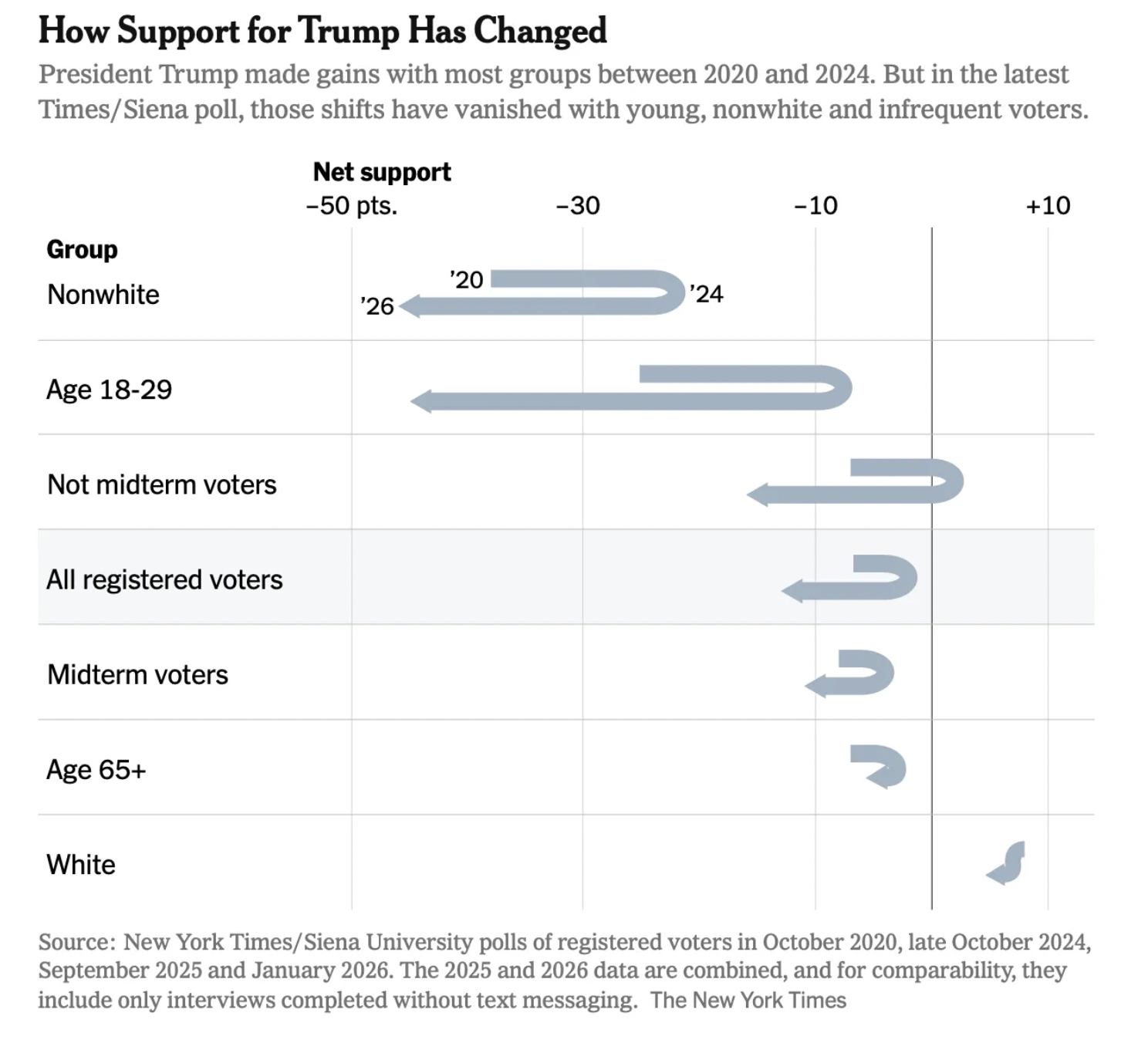 As The New York Times reported this week, Trump’s support among key groups he persuaded to vote for him in 2024 — notably, young, Black, and Latino voters — has now sunk below levels measured in the run-up to the 2020 election (which Trump lost to Joe Biden by 4.5 points in the national popular vote).