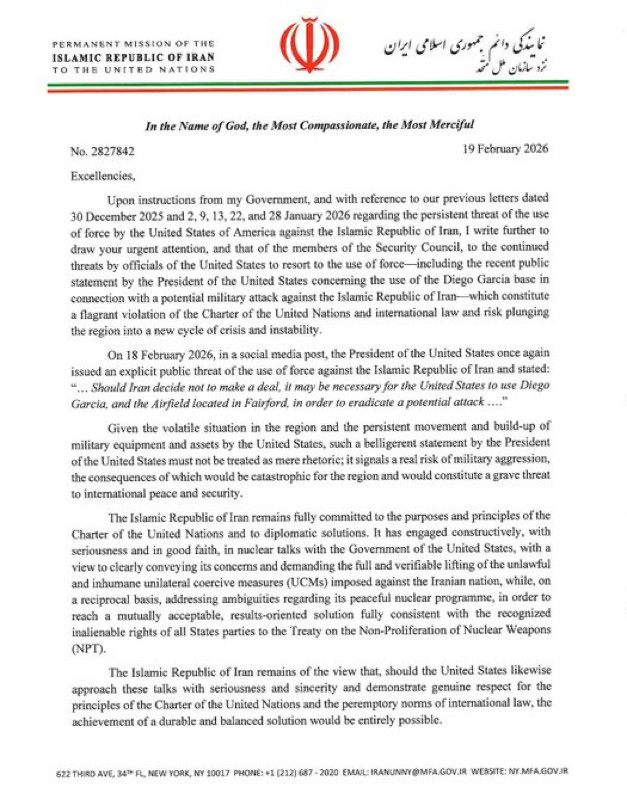 Iran has written to the United Nations that “all bases, facilities, and assets of the hostile force in the region would constitute legitimate targets” if it is attacked.