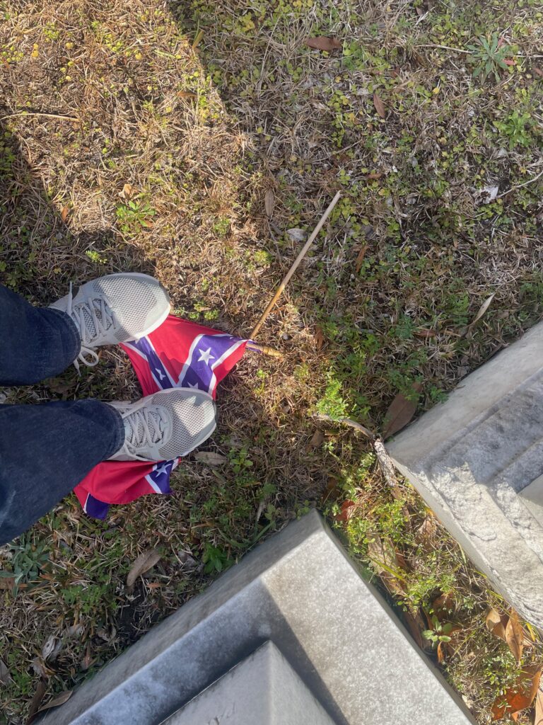 Also, can you help me out here–how did that Confederate flag up on Rhett’s grave end up broken and under my muddy shoes? It’s a real mystery.