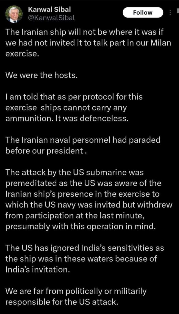 Now I’m no expert on war crimes or the law of the sea or whatever else might be implicated here, but this sounds . . . not good. (The author is the former Foreign Secretary of India):
