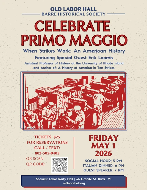 Every year, the Old Labor Hall in Barre, Vermont, that great home of the granite workers and its union, hosts a big May Day talk, cosponsored by the Vermont AFL-CIO. This year it is me. If you are in the area, come out and say hello. Info in image below, even if I haven’t been an assistant professor in a decade now: